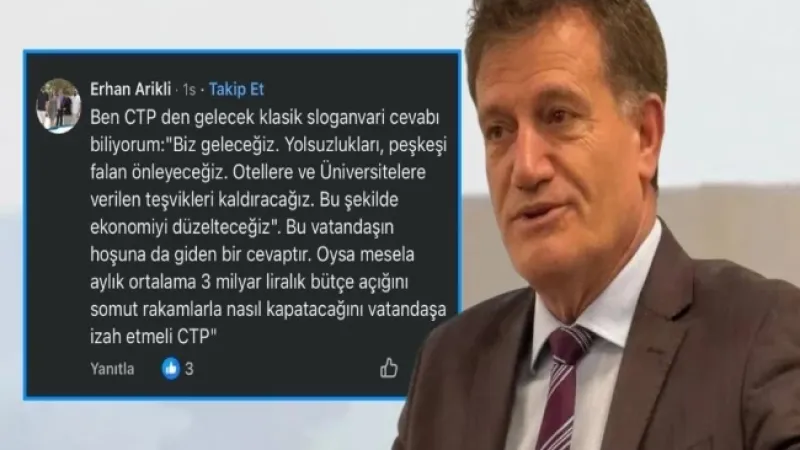 Arıklı, CTP'nin aylık 3 milyar TL'lik açığını kapatma planını somut rakamlarla açıklaması gerektiğini vurgulayarak, sloganlarla çözüme gidilemeyeceğini eleştirdi.