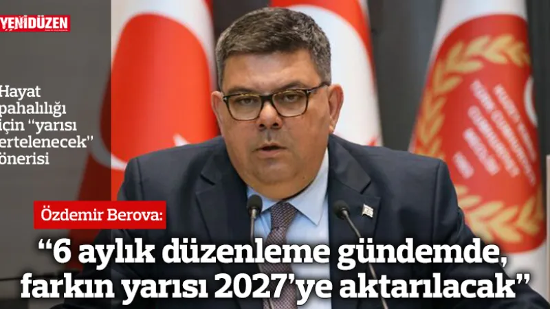 Maliye Bakanı Özdemir Berova, Meclis'te yaptığı açıklamada, hayat pahalılığına karşı altı aylık bir düzenlemenin gündemde olduğunu ve bu düzenlemenin farkının yarısının 2027'ye aktarılacağını belirtti.
