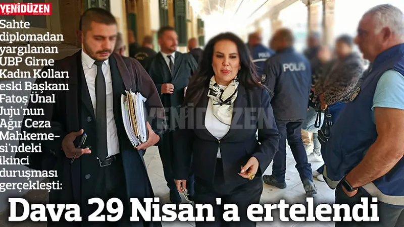 Dava 29 Nisan'a ertelendiUBP Girne Kadın Kolları eski Başkanı Fatoş Ünal Juju'nun sahte diplomadan yargılandığı dava itham için 29 Nisan'a ertelendi.