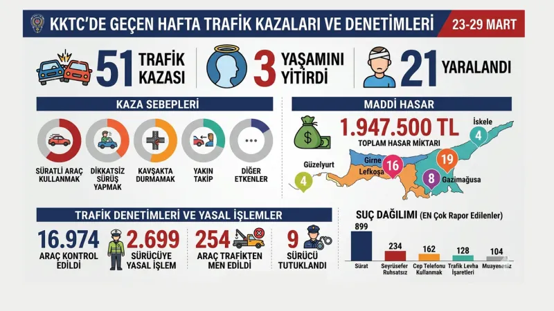 KKTC'de 23-29 Mart tarihleri arasında 51 trafik kazası yaşandı. Kazalarda 3 kişi hayatını kaybederken, 21 kişi yaralandı. Ana nedenler arasında aşırı hız, dikkatsizlik ve kavşak kurallarına uymamak bulunuyor.