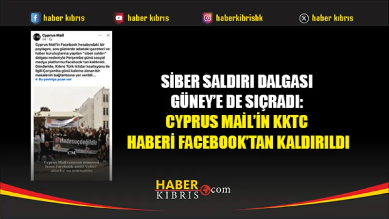 Siber saldırılar, Güney Kıbrıs'a da ulaştı; Cyprus Mail'in Kuzey Kıbrıs ile ilgili haberi Facebook'tan kaldırıldı.