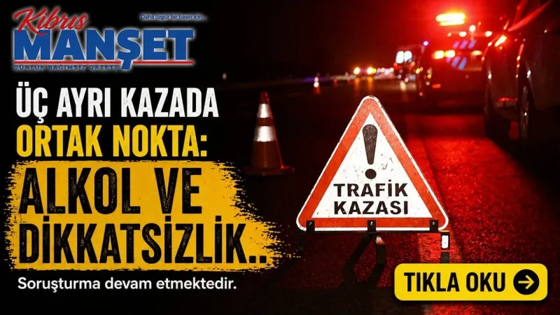 Girne'de, 25 Nisan 2026'da meydana gelen üç ayrı kaza, alkol ve dikkatsizlik nedeniyle gerçekleşti. Bir sürücü, alkollü olarak dikkatsizce araç kullanırken direksiyon hakimiyetini kaybetti.