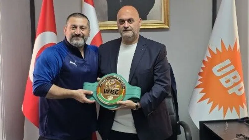 Gazimağusa'da düzenlenecek Dünya Ağır Siklet Boks Şampiyonası öncesinde, eski milli boksör Burak Mataracı, UBP Gazimağusa İlçe Başkanı Nahit Öncü'ye Muhammed Ali'ye ait WBC kemerini takdim etti.
